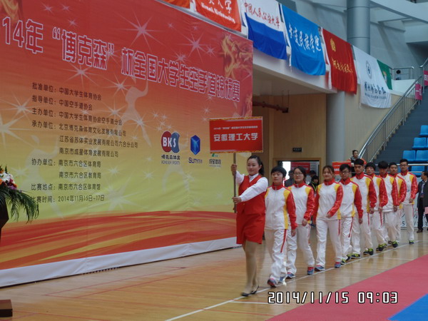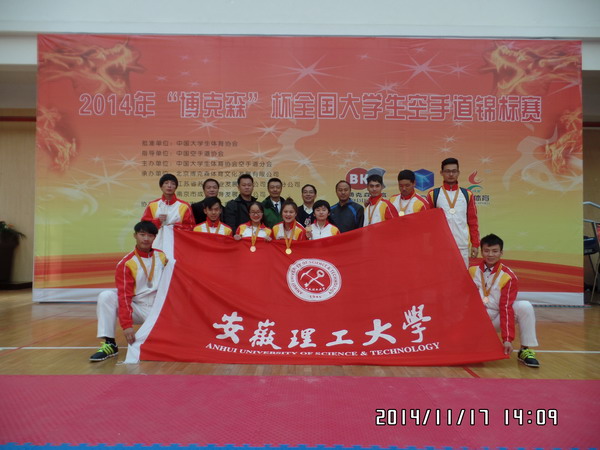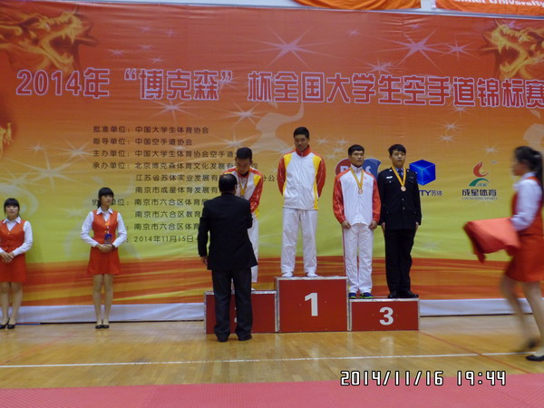 11月17日下午,由南京市六合区承办的2014年中国大学生空手道锦标赛在六合区体育馆落下帷幕,我校代表队以2金4银4铜的优异成绩,位居C组18所高校奖牌榜总数第2名。