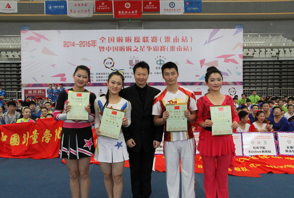 8日下午,2014-2015年全国啦啦联赛(淮南站)暨中国啦啦操之星争霸赛(淮南站)在我校教学楼前广场举行开幕式。校党委书记颜事龙,国家体育总局体操运动管理中心中国体操领队叶振南,淮南市人民政府副市长阮怀楼,我校副校长叶醒狮、刘泽功、孟祥瑞、校纪委书记周峰,淮南师范学院纪委书记周学锋,淮南市体育局局长金昶,全国啦啦操委员会副秘书长李育林,我校学院(部)和相关职能部门负责人出席开幕式并在前排就座。