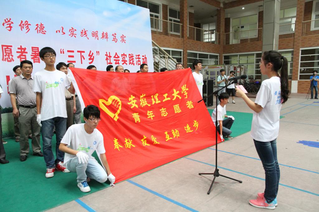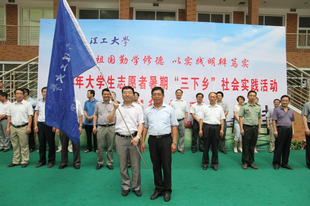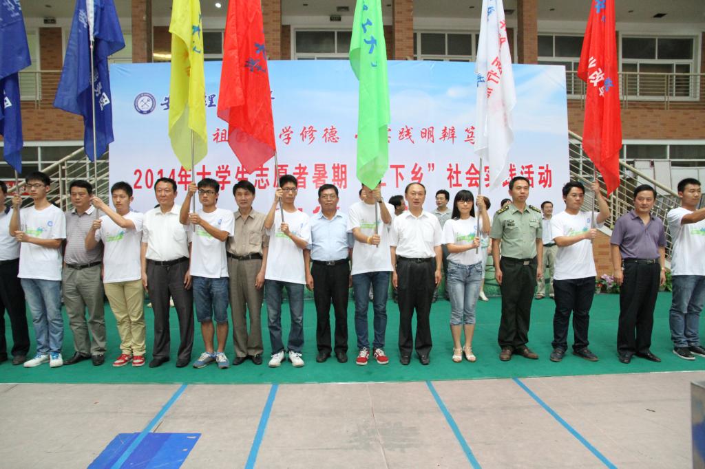 校党委书记颜事龙宣布安徽理工大学2014年暑期“三下乡”社会实践服务团队出征,校领导、各职能部门负责人、南京军区驻校选培办金绍启中校分别为国家级、校级重点团队、国防生当兵实践团锻炼团授旗。