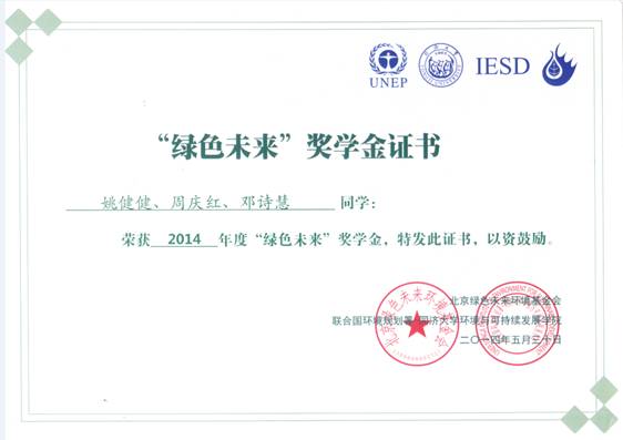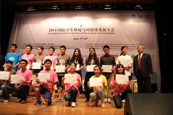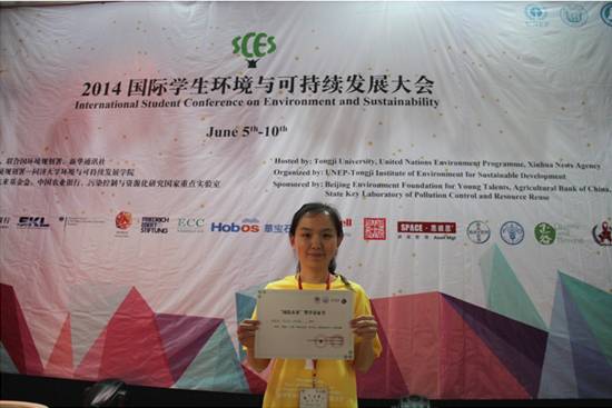 6月5日世界环境日,姚健健代表本团队在上海同济大学,与北大、清华、厦大、同济等名?;窠蓖б黄鸪鱿肆瞎肪彻婊鹁侔斓摹?014国际学生环境与可持续发展大会(2014 International Student Conference on Environment and Sustainability”暨“绿色未来奖”颁奖典礼。