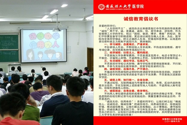 一直以来,我校十分注重对学生进行包括诚信教育在内的社会主义核心价值观和中华传统美德教育。我校今年的诚信教育主题月活动,以校、院、年级(专业或班级)三级网络为平台,周密部署、分工协同、精心组织实施。5月7日,学校及时下发了《关于开展学生资助诚信教育主题月活动的通知》,统筹推进全校诚信教育主题月活动的开展;各学院也分别结合自身特点制定诚信教育主题月活动方案并组织实施;在活动开展过程中,校学生资助管理中心和各学院及时跟进并做好活动的校内外宣传报道,进一步提高了活动开展的影响力和效果。