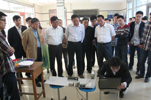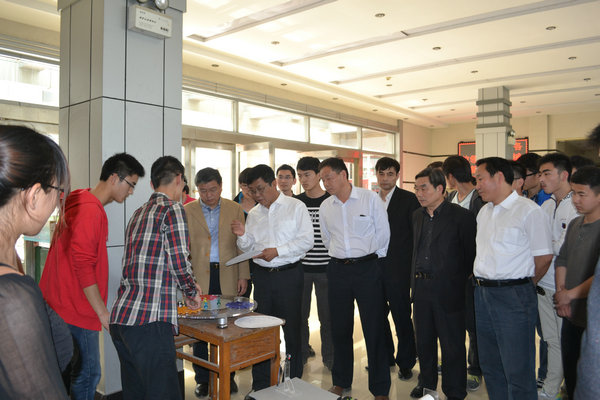 5月7日下午,校党委书记颜事龙在教务处处长宫能平、实验室与设备管理处处长苏嘉银、学生处处长田中良的陪同下,来到校本部实验中心一楼大厅看望慰问了即将参加第六届全国大学生机械创新设计大赛安徽赛区竞赛的学生和指导老师,并参观了参赛项目作品。