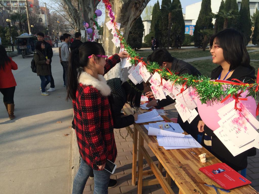 春风送暖,桃花映红,3月8日至12日,春寒未退的校园里洋溢着别样的温暖。一大早,女生宿舍的门前就挂上了五彩缤纷的丝带和卡片,“欲笺心事,愿君来听”,这也是女生文化节系列活动中“最浪漫的事”。女生们在粉色的卡片上幸福地写下自己的小小心愿,系在彩绳上,等待着有缘人的聆听?!跋M髂昕佳谐晒?!”“希望妈妈身体健康”、“希望收获一份甜蜜的爱情”……一张张卡片诉说着一个个女生心中的小秘密,包含着暖暖的爱与浓浓的情,随风轻轻摆动,在温暖的阳光下显得格外温馨。