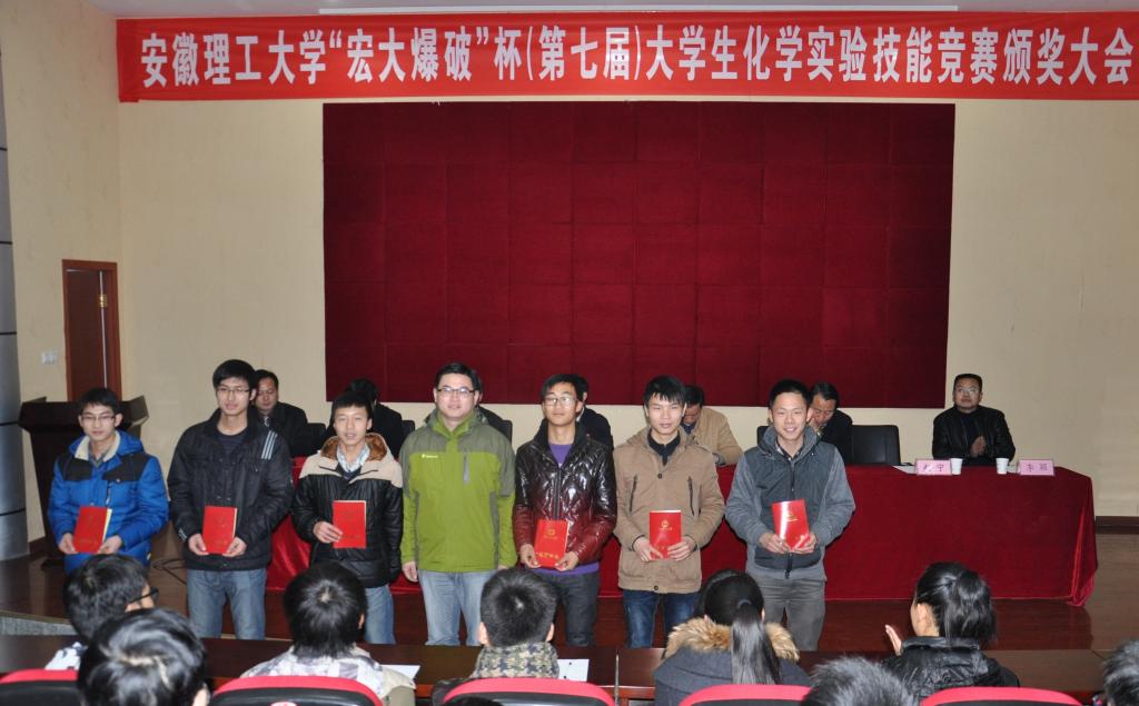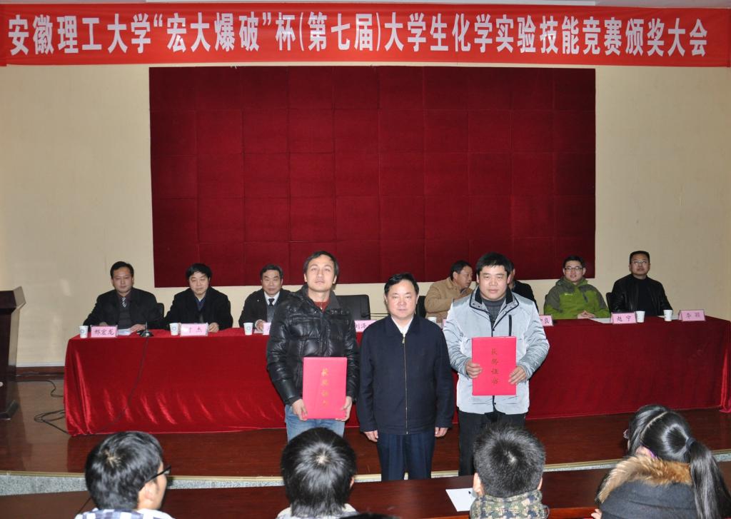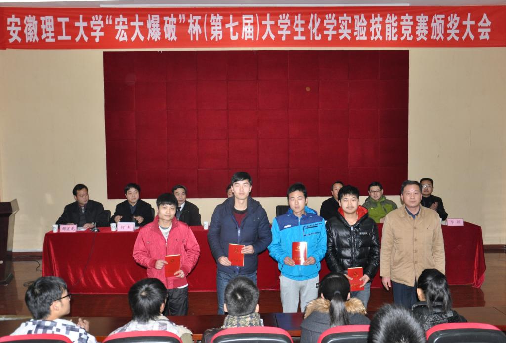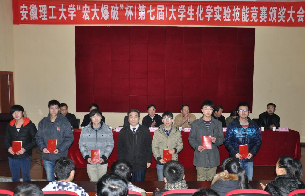 1月7日下午,安徽理工大学“宏大爆破”杯(第七届)化学实验技能竞赛颁奖大会在校本部举行,副校长刘泽功出席颁奖大会并讲话。教务处、实验室与设备管理处、学生处、校团委、校友办及化学工程学院相关负责人及获奖同学代表共同参加大会?;Чこ萄г涸撼ず谓艽泶笕槲嵝亮吮碚镁龆??;嵋橛苫Чこ萄г焊痹撼ば虾炅鞒?。