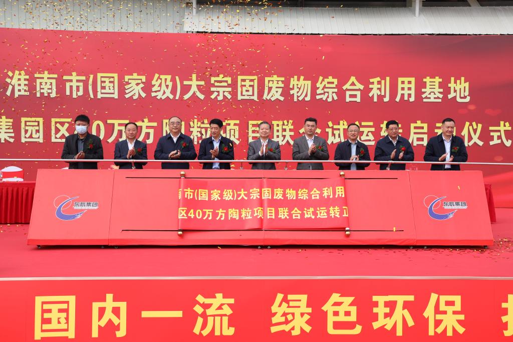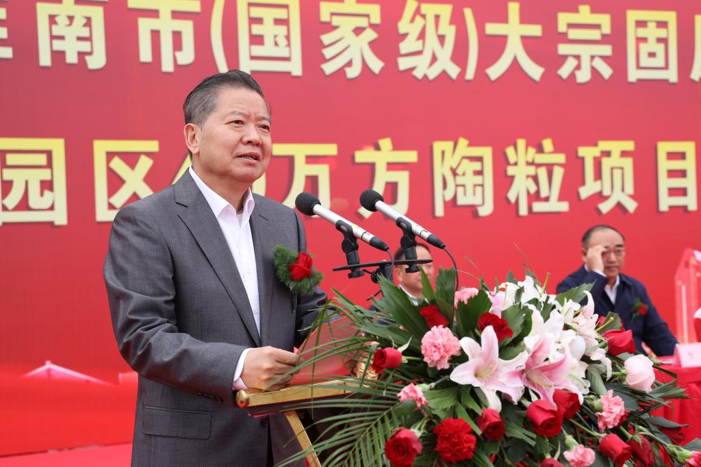 袁亮院士致辞中深情回忆了在淮南矿业集团35年工作经历,谋划并见证了集团公司“建大矿、办大电、做资本”的发展壮大历程,高度肯定了淮南东辰集团积极主动作为,为淮南市固废高值资源化利用开创了新的发展路径。他向与会嘉宾介绍了学校的发展历程,在全面实现全国一本招生及招生规模、高峰学科与国家级科研平台建设等方面取得的优异成绩。他指出,学校2018年与淮南东辰集团签署战略合作协议以来,校企共建了煤系固废物综合利用与采煤沉陷综合治理研究院,围绕煤矸石、粉煤灰高值化利用研发方向,共同申报并获批国家发改委国家级大宗固废物综合利用基地,同时双方在技术攻关、检测检验方面开展鼎力合作,助推东辰集团推进自主关键核心技术攻关及工艺研发,40万方陶粒项目生产线正式启动,标志着实验室成果已经向工业化生产转化,意味着煤矸石高值化利用取得了新的突破,见证了校企合作结出了新的硕果。他强调,学校将进一步深化与东辰集团合作,利用材料学科优质资源,与东辰集团共同申报省部级科研平台,加快固废资源化利用领域科技成果研发与转化,共同为淮南矿区转型发展和美丽淮南建设作出贡献。
