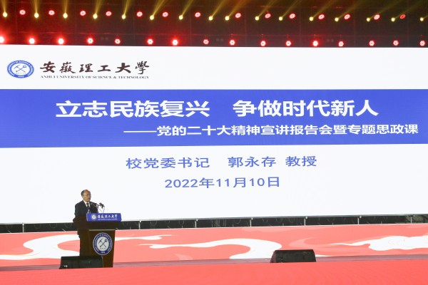 11月10日晚,在学?!把岸?永远跟党走 奋进新征程”2022迎新美育晚会现场,校党委书记郭永存为2022级全体新生上专题思政课,宣讲党的二十大精神。