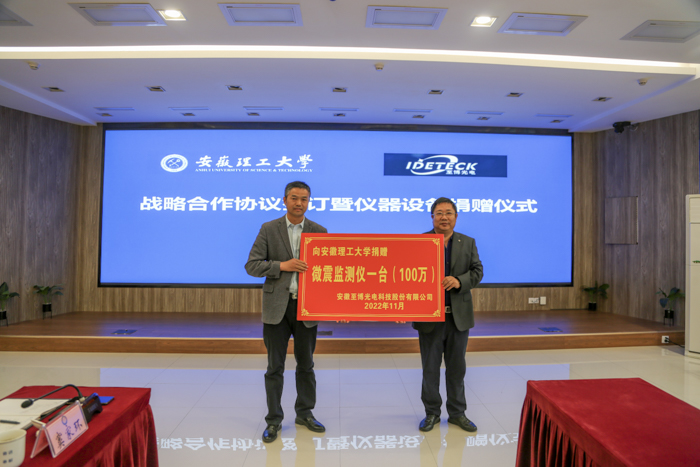 俞本立代表至博光电对郭永存书记、袁亮校长的热情接待以及长期以来学校给予的帮助与支持表示衷心感谢。他表示本次签约和捐赠价值百万的仪器设备,使至博光电搭上安徽理工大学高速发展的列车,是公司的光电技术优势和安徽理工大学的资源优势强强结合,能为至博光电的发展创造更多的机遇。他表示双方将共同在矿山安全、城市生命线、“双碳”等领域取得更大的成就,为国家与区域经济发展贡献更大力量。