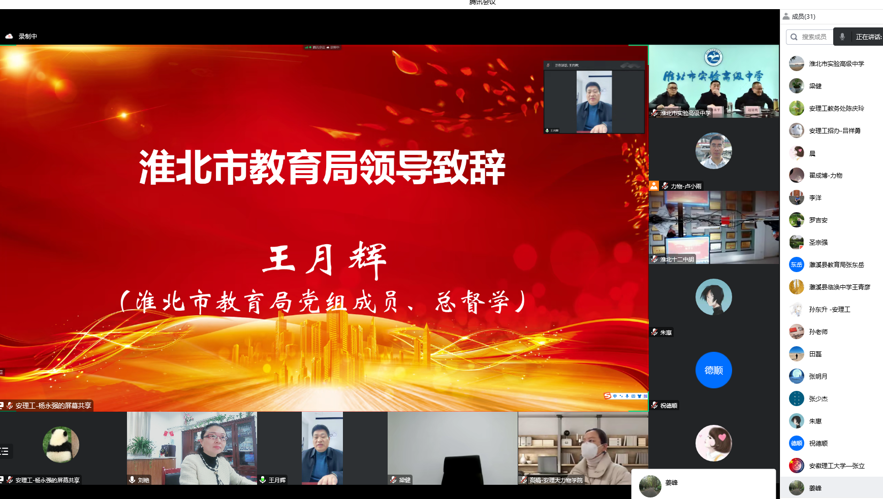 为继续做深做实优质生源地建设工作,加强与优质生源地高中的交流联系,1月6日上午,由安徽理工大学主办、力学与光电物理学院组织承办的安徽理工大学-淮北市优质生源地校长论坛以线上的形式举行?;幢笔薪逃鞴懿棵帕斓?、优质生源基地中学相关领导和我校教务处、力学与光电物理学院领导等参加了会议?;嵋橛闪ρв牍獾缥锢硌г旱澄榧橇跹拗鞒?。