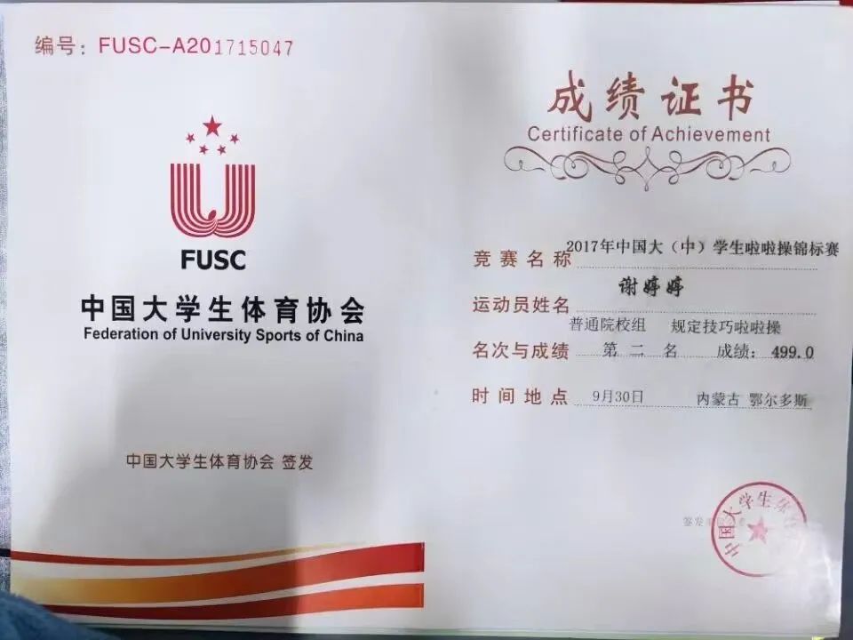 谢婷婷参加过大大小小的比赛,如今回忆起来还历历在目。2017年啦啦操大(中)学生啦啦操锦标赛是谢婷婷第一次参加比赛,也是她难以释怀的一场比赛。在这一次比赛里,他们队伍获得了普通院校组团体奖第一名、规定技巧啦啦操第二名。或许遗憾才是世间常态,在这场比赛出征前一晚,她的祖父过世了,可为了不影响团队的进度,她依旧选择继续参赛。她说:“我们是一个团队,如果我在这个时候走了,大家肯定会猝不及防,需要加急调整队形,会给团队制造麻烦?!痹诒热曷崾?,她才匆匆赶回了家中。