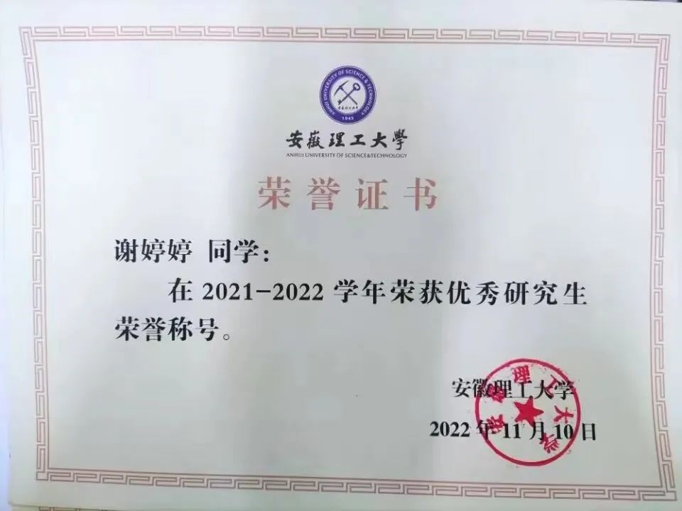 谢婷婷,中共党员,安徽理工大学化学工程学院化学工程与工艺专业2016级本科生、化学工程与技术专业2020级研究生。研究生期间荣获两次安徽理工大学“优秀研究生”、一次硕士研究生一等学业奖学金和一次国家奖学金,曾获得“省级优秀毕业生”、安徽理工大学“优秀共青团员”荣誉称号。本科生期间连续两年获“三好学生”。2017年获啦啦操大(中)学生啦啦操锦标赛普通院校组团体奖第一名、规定技巧啦啦操第二名,2017-2018年全国啦啦操联赛(合肥站)新站高新区啦啦操大赛公开青年丙组集体技巧高级(3-4级)自选动作混合第一名、集体花球自选动作第二名,2018年中国校园啦啦操锦标赛普通院校组-集体规定技巧第二名,2018年中国校园啦啦操锦标赛普通院校组-混合配合技巧(五级)第二名。2022年谢婷婷在线发表了两篇sci论文:“Ultrasmall Co-NiP embedded into lantern shaped composite achieved by coordination confinement phosphorization for overall water splitting”和“Metal-organic framework derived Fe3C nanoparticles coupled single-atomic iron for boosting oxygen reduction reaction”,授权一篇专利:“Cadmium metal-organic complex with fluorescence, preparation method therefor and application thereof”。