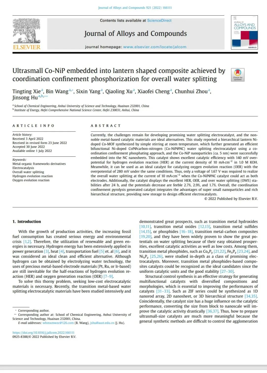 辛勤的馈赠总是丰厚的,今年,她成功根据实验成果连续发表了两篇SCI论文:“ Ultrasmall Co-NiP embedded into lantern shaped composite achieved by coordination confinement phosphorization for overall water splitting”和“Metal-organic framework derived Fe3C nanoparticles coupled single-atomic iron for boosting oxygen reduction reaction”。众所周知,化石燃料消耗的增加造成了严重的能源和环境?;?,氢能是一种理想和高效的清洁能源。为了降低电解水的成本,需要对过渡金属基水分类电催化材料进行深入研究。她的第一篇论文研究了一种在室温下通过简单搅拌合成的分层灯笼状掺Ni Co-MOF,使用共配约束磷化法进一步产生了高效的双功能掺Ni CoP@NC全分解水电催化剂;高效且环保的能源转换和储存系统,如金属空气电池和燃料电池,已成为研究热点,开发和探索高效的非贵金属电催化剂至关重要。第二篇论文研究了通过配位热解效应成功构建的Zn/Fe-金属-有机框架衍生的Fe3C耦合FeNx催化剂。