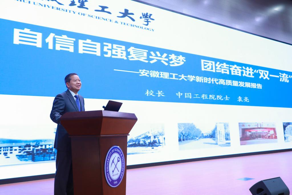 袁亮作了题为《自信自强复兴梦 团结奋进“双一流”》的学校发展报告。他从学科整体实力显著提升、人才培养质量显著提升、队伍建设水平显著提升、科技创新能力显著提升、办学布局层次显著提升、开放办学水平显著提升、社会服务能级显著提升等方面介绍了近年来学校发展成就和“双一流”创建取得的标志性成果。他指出,安徽理工大学在习近平新时代中国特色社会主义思想科学指引下,坚持以“双一流”创建为引领,学科整体实力显著提升,成为安徽省拥有A类学科的三所高校之一,高峰学科建设进入快车道,推进学校高质量发展。学校坚持新发展理念,构建新发展格局,推深做实“四个融入”发展战略,践行“三有三进三到”办学理念,着力提升人才培养质量,服务中国式教育现代化。当前,学校正处于“双一流”创建新征程的起步关键阶段,学校将坚持为党育人、为国育才,擦亮底色、突出特色、提升成色,紧跟习近平总书记,奋进新征程、建功新时代,全面提高人才培养质量,全力推动“双一流”创建再出发,奋力书写中国式现代化的安理篇章!