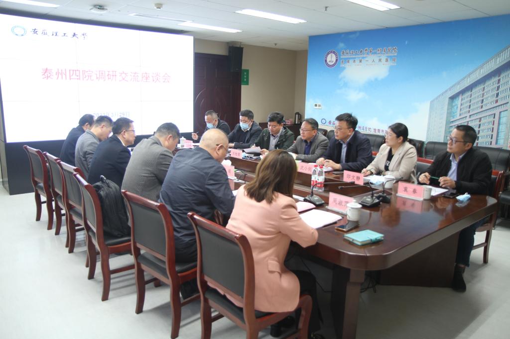 3月29日,泰州市第四人民医院院长刘桂荣会同泰州市海陵区卫生健康委员会党组书记、主任谭忠一行8人来校交流,商谈临床教学基地及GCP建设事宜,校党委常委、副校长、医学部主任鲁超出席会议并讲话。
