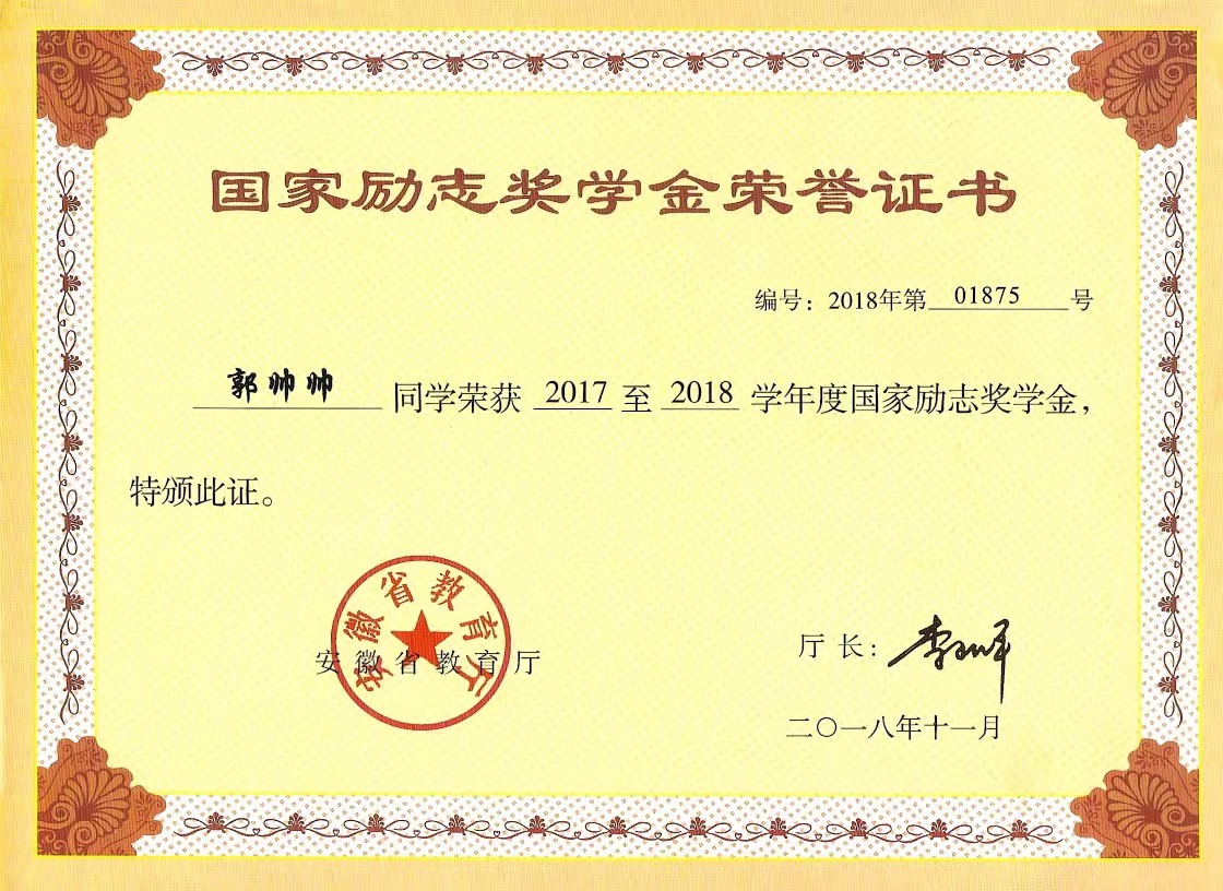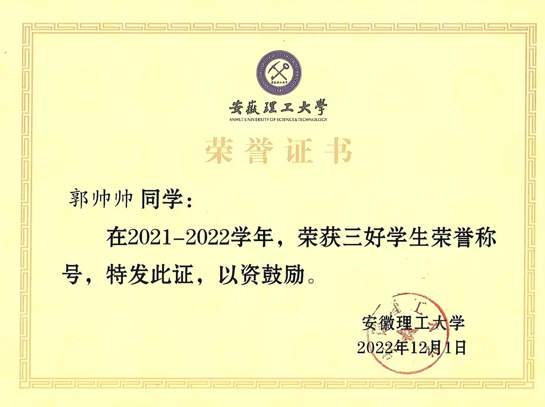 郭帅帅,中共党员,安徽理工大学2017级学生,现就读于电气与信息工程学院电气工程及其自动化专业。大学期间应征入伍,在部队期间获得“四有”优秀士兵两次,在校期间曾获得国家励志奖学金,安徽理工大学校一等奖学金,优秀学生干部,优秀共青团员,优秀共青团员标兵,军事训练“优秀学员”等荣誉称号。日前,郭帅帅已被华北电力大学电气工程专业录取为硕士研究生。