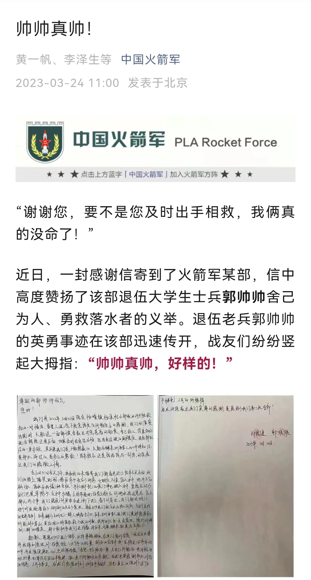 最近,中国火箭军某部收到了一封感谢信,信中表达了对我校2017级学子、火箭军退伍军人郭帅帅舍己救人的无限感激,高度赞扬了他见义勇为的精神。郭帅帅的事迹迅速传开,从部队到学校,大家纷纷对郭帅帅竖起大拇指,盛赞他无畏的勇气、坚韧的精神!火箭军也在其官方微信公众号上对郭帅帅的事迹给予报道。