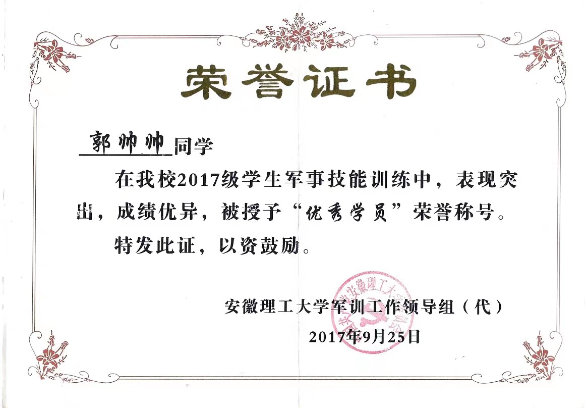 两年的军旅生活,郭帅帅不仅达到了自己的从军的目标,还获得“军事训练优秀学员”称号和两次“四有优秀士兵”嘉奖(“四有”:有灵魂、有品德、有本事、有血性)。然而这并不是最大的收获,于他而言最大的收获是这份经历。工作时的日夜煎熬,面对每一次濒临崩溃的瞬间,郭帅帅抱着再坚持一点,咬咬牙再撑一会的信念熬过了一个又一个低谷,跨越了一个又一个障碍?!白咭徊?,再走一步”是郭帅帅面对困难时所有行动的最完美概括。同时军旅生活也让郭帅帅的人生态度有了新的变化,“实事求是”是郭帅帅百谈不厌的四字箴言,就连他的手机壳都赫然刻着“实事求是”四个大字。“人生一定要多经历,要有目标,然后抱着决然的态度,不可妄自菲薄,不可妄自尊大,实事求是,全身心投入进去那么结果一定不会差!事在人为!”郭帅帅一丝不苟,字字用力。这种态度他一直保持到现在,相信他也会一直坚持下去,同时这种态度也值得我们当代青年学习和践行!