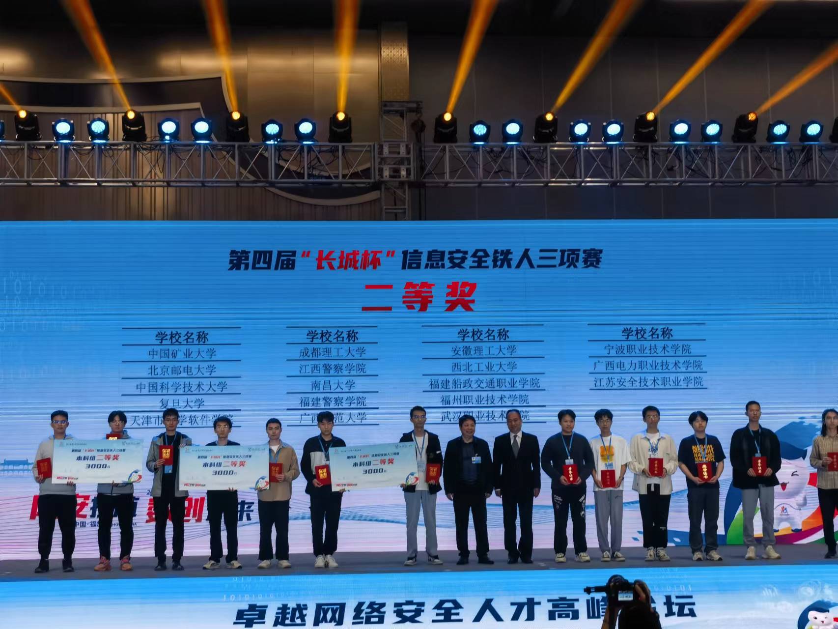 日前,第四届“长城杯”信息安全铁人三项赛总决赛在福州落下帷幕。全国376所院校报名参赛,经分区赛选拔,共有80余所院校入围决赛。我校计算机科学与工程学院2020级信息安全专业马博文、张志豪、李秉臻、史家骏4名同学组成的团队与中国科学技术大学、复旦大学、西北工业大学等实力强劲的队伍同台竞技,最终荣获全国总决赛二等奖的好成绩,实现了我校在本项赛事国赛中获奖零的突破。我校参赛团队由方贤进教授任领队,赵宝、王艳任指导老师。