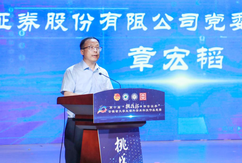 章宏韬在致辞中代表华安证券,向与会领导和全校师生对大赛的支持表示感谢!向大赛中取得优异成绩的团体和个人表示祝贺!他表示,本届“挑战杯”是科教兴国战略、人才强国战略、创新驱动发展战略的生动实践,取得了令人满意的成效,达到了一个新的高度??萍汲晒迪植底?,必须以金融为支撑,资本市场发挥着不可替代的作用?;仓と魑不帐」士毓傻纳鲜腥?,将责任、使命融于血脉,坚定不移服务于党的金融事业,始终注重立足安徽、深耕安徽、服务安徽,致力于赋能实体经济。近年来,华安证券通过多途径提升青年群体金融素养,促进科技成果转化,助力金融与科技、科技与投资的深度融合?;仓と⒒忧帕号Υ饔?,助力更多的高校青年更好适应经济社会发展要求和成长成才需要。 希望各位选手在继续锻炼中练就过硬翅膀,在继续挑战中放飞青春梦想!祝愿大学生朋友胸怀“国之大者”、不断追求卓越,把青春融入中国式现代化建设和民族伟大复兴的事业!