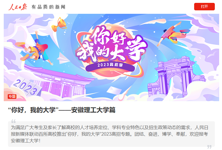 为全面展示展示学校办学特色和人才培养成效,助力线上招生宣传工作,近日,学校联合人民日报客户端正式上线“你好,我的大学”安徽理工大学招生专题。