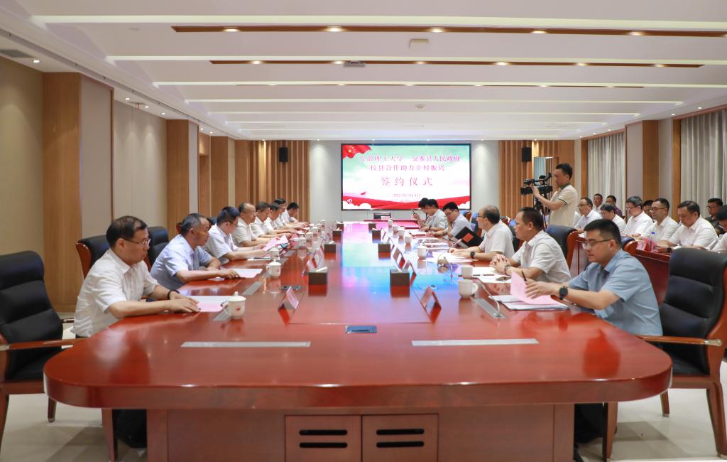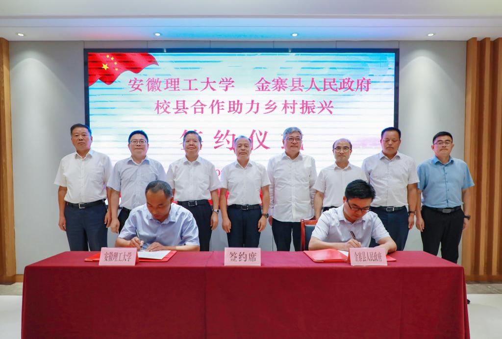 9月4日上午,学校与金寨县人民政府在安徽金寨干部学院隆重举行校县合作助力乡村振兴战略合作签约仪式。校党委书记郭永存,校党委副书记、校长袁亮院士,六安市委常委、金寨县委书记汪冬,县委副书记、县长张涧出席仪式。校党委副书记、常务副校长余玉刚,校党委常委、副校长宫能平、张平松,“大国工匠”朱恒银教授,县委常委、县委组织部部长倪秀锋,县委常委、县委办主任张贻胜,副县长陈奎松等参加签字仪式。张涧主持签约仪式。