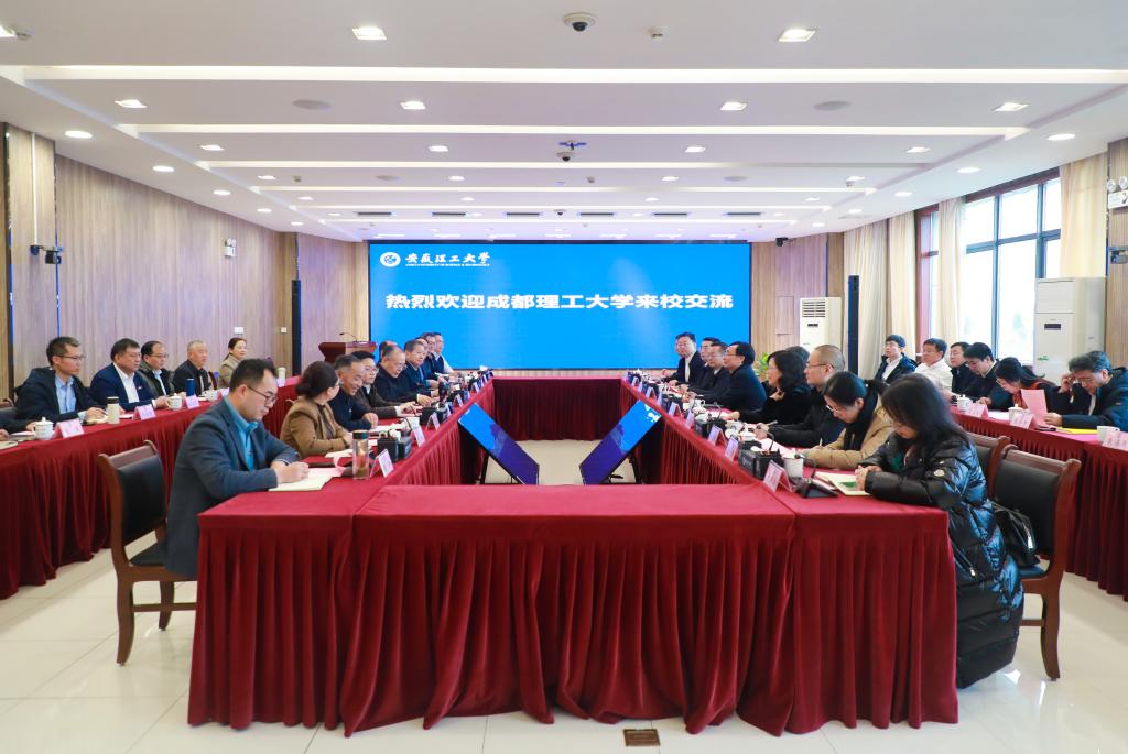 学校党政办公室、合作发展处、人事处、研究生院、科研部、发展规划处、地球与环境学院、安全科学与工程学院、矿业工程学院、材料科学与工程学院、化工与爆破学院、力学与光电物理学院,以及成都理工大学相关部门和学院负责人参加交流。
