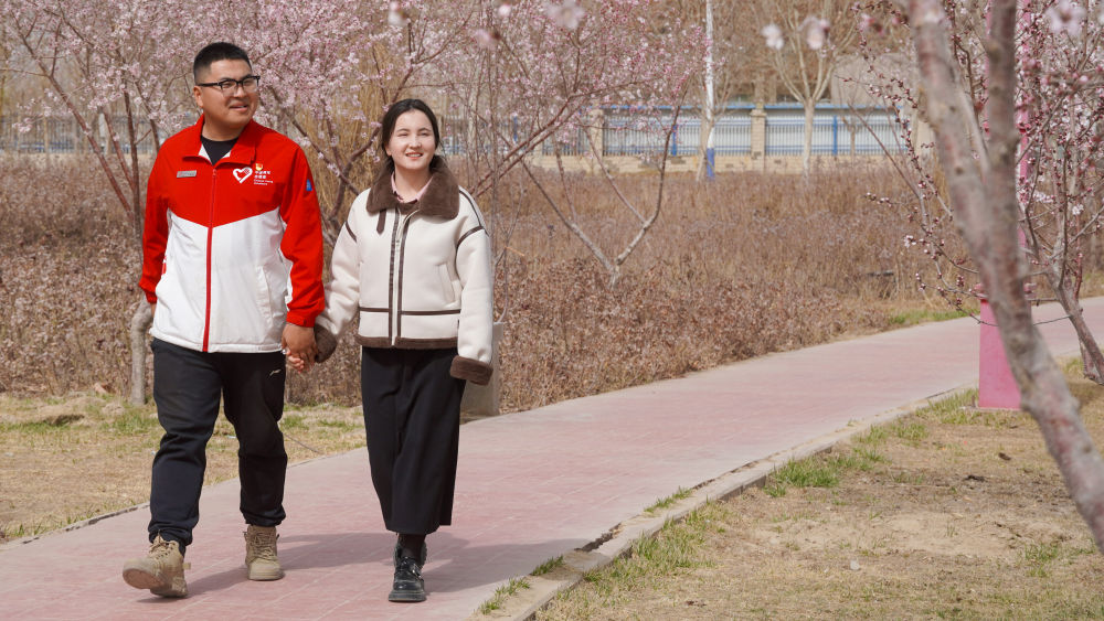 徐灿(左)与女友古丽苏姆·艾合麦提在公园散步 新华社记者 高晗 摄