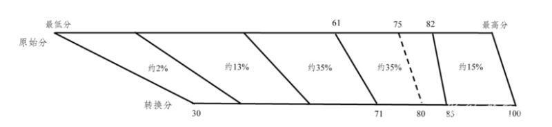 第二步,同一等级内,根据考生的原始分、所在等级的原始分区间和转换分区间,按照分数转换公式,计算得到考生的转换分。